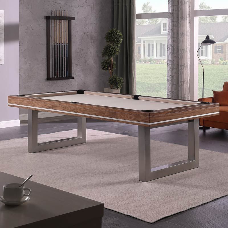 Biliardo piu’ vicino alle moderne tendenze di design con linee pulite ed essenziali ,telaio e’ monoscocca in multistrato di betulla,finiture in nobilitato rovere grigio tortora.