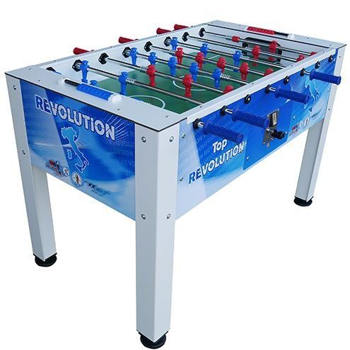 Calciobalilla con gettoniera con metti dal nuovo design, con piedini dalla forma innovativa. Piano di gioco in laminato plastico, fresato sul perimetro per annullare lo scalino tra il piano e fermavetro (SISTEMA BREVETTATO).