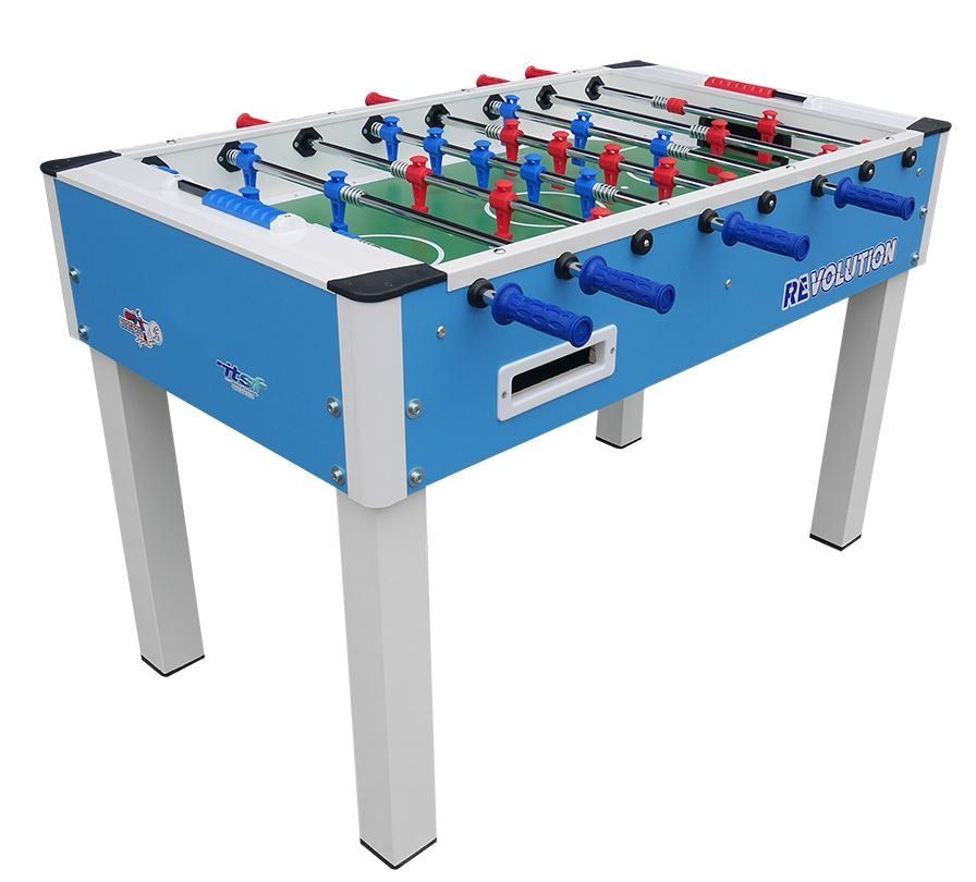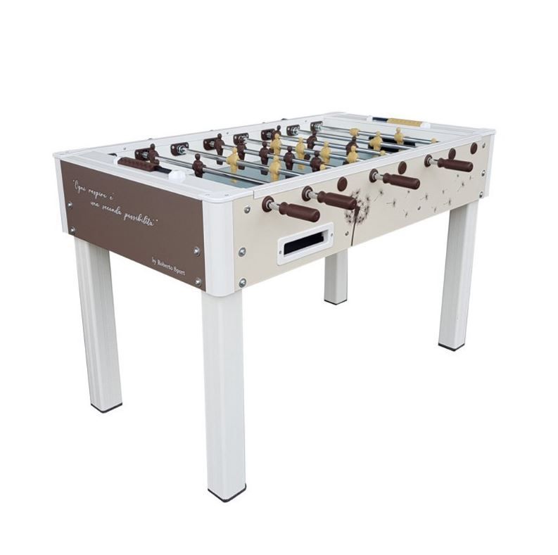 Calciobalilla da esterno grazie all'utilizzo di materiali waterproof, vetro verniciato, gambe con piedino regolabile.